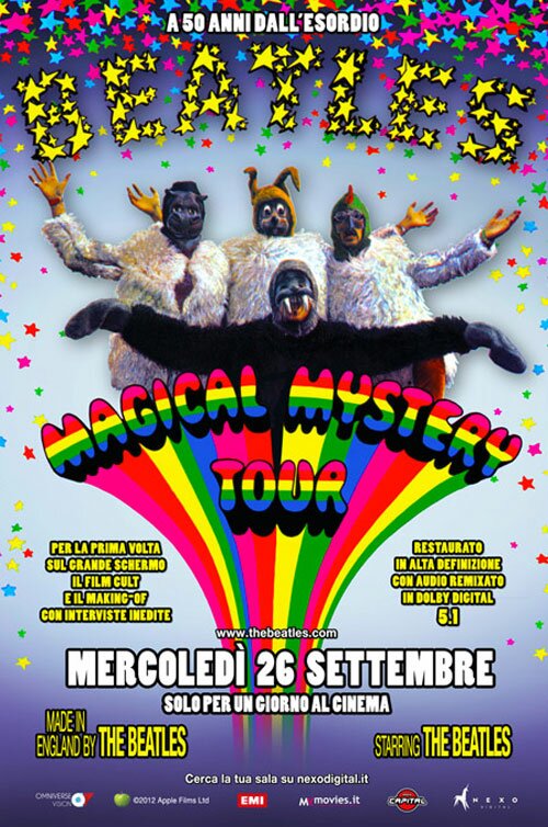 Il 26 settembre sarà distribuito nelle sale cinematografiche il film Magical Mistery Tour, restaurato e remixato, girato dai Beatles nel 1967. Il film era stato trasmesso in bianco e nero dalla BBC nel Natale dello stesso anno, mai però in sala data la sua durata di soli 53 minuti, ma anche a causa delle critiche negative ricevute in quel periodo. Oggi è considerato un cult. Il 9 ottobre sarà messo in vendita il Blu-ray, mentre è già disponibile Il libro bianco dei Beatles, di Franco Zanetti (le storie e le storie di tutte le canzoni), Giunti editore. Nel 1967 durante una trasferta a Los Angeles Paul McCarthy era rimasto colpito dal gruppo di hippie Merry Pranksters, seguaci di Ken Kesey, un esponente della controcultura americana, che si spostavano attraverso il paese a bordo di un coloratissimo autobus. A questa visione Paul aveva associato la tradizione inglese dei cosiddetti Mistery Tours, gite verso destinazione ignota i cui partecipanti appartenevano alla classe operaia (ma anche riferimento ai trip di acido). Aveva deciso così di girare un film breve, come "contenitore" di alcune delle canzoni dell'omonimo album, successivo a Sgt Pepper's Lonely Hearts Club Band.